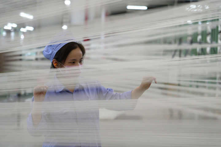 工作人员在位于河南省平顶山市的中国平煤神马集团帘子布发展公司布机车间检查丝线情况(2024年3月28日摄)。