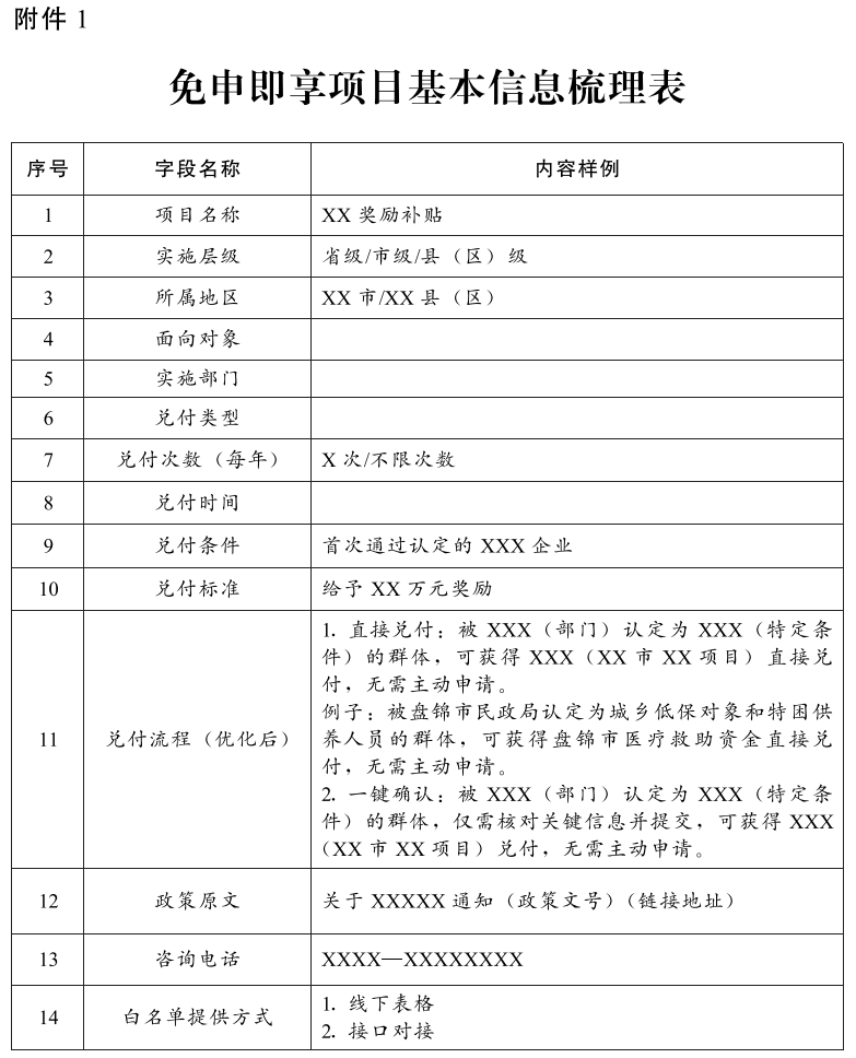 对于纳入免申即享清单的政策,已实现“免申”的,要完善兑现条件、兑现标准和时间流程等内容,逐项填写附件1,由本级营商(大数据)部门组织协调,将政策接入“免申即享”专区;尚未实现“免申”的,要开展政策兑现流程再造,免除申请程序之后接入专区,向社会公开。专区应用大数据技术,主动、及时向企业推送已享受的免申即享政策信息。