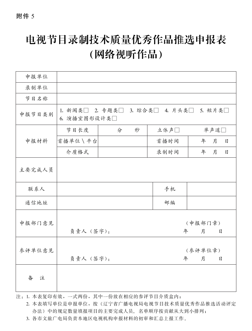 5.电视节目录制技术质量优秀作品推选申报表(网络视听作品)