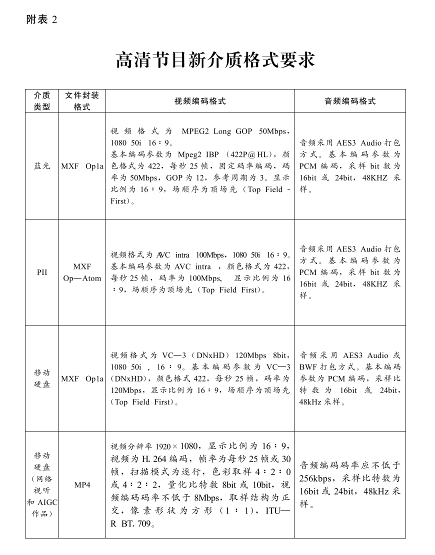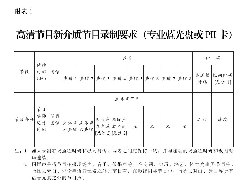 3.参评录制技术质量推选的节目介质为移动硬盘(节目可集中存储在移动硬盘中),参评高清播出技术质量推选的节目介质为专业蓝光盘或PII卡,申报单位应严格按照有关录制和交换规范中规定的内容依次进行录制,具体规定见下表: